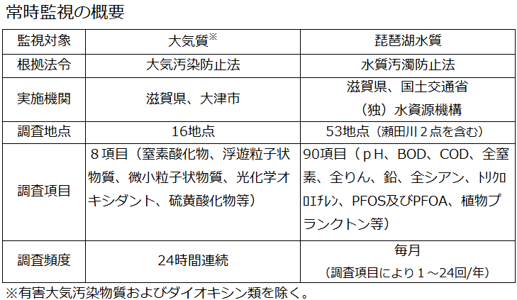 気汚染防止法に基づき、大気汚染に係る環境基準が定められている物質等について、大津市とともに大気中の濃度を測定しています。このうち、窒素酸化物、微小粒子状物質(PM2.5)、光化学オキシダント等8項目について、県内16ヶ所にある大気自動測定局で24時間連続監視しています。