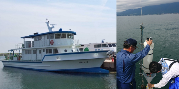 水質調査船「びわかぜ」と琵琶湖水質調査の様子